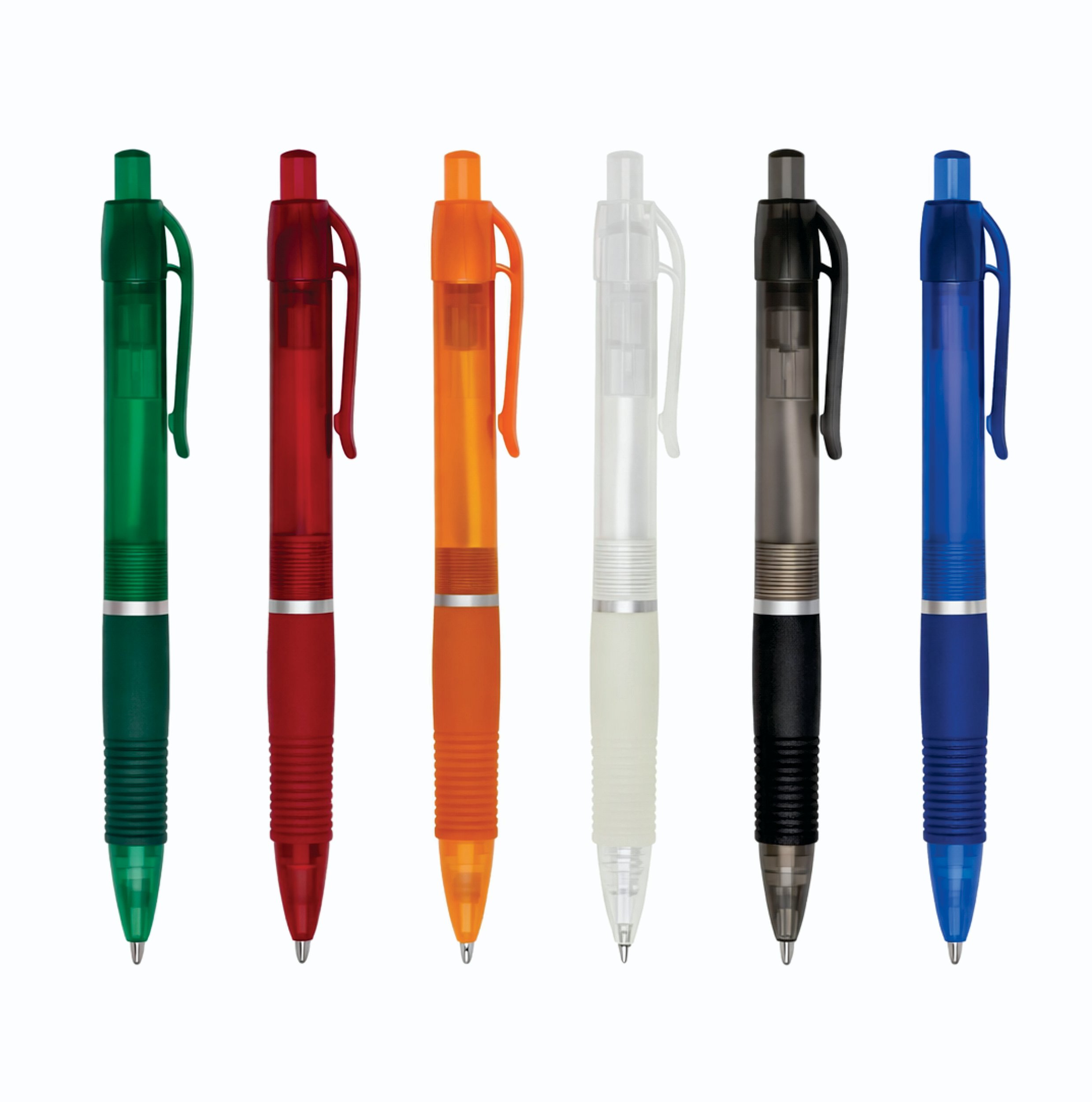 O modelo conta com formato ergonômico que proporciona escrita confortável e acionamento por clique de fácil manuseio. A personalização em serigrafia permite aplicação clara da identidade visual, com boa definição e leitura, garantindo visibilidade consistente da marca em diferentes contextos de uso.